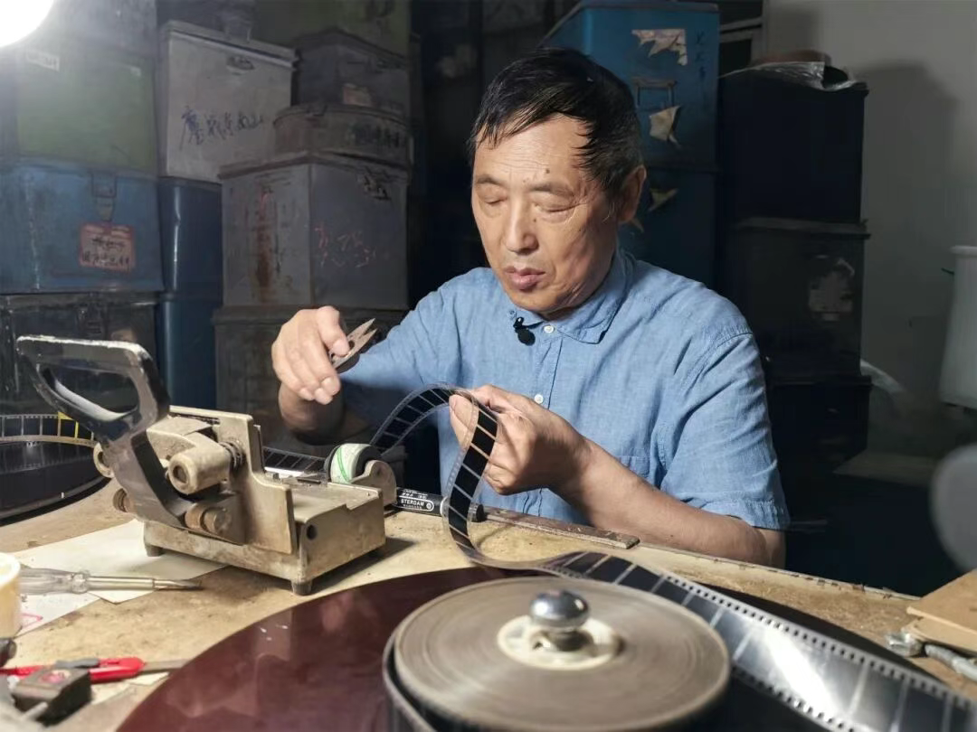 电影胶片不易保存,时间长了,沈宏需要给胶片进行“倒片”,起到透气的作用,以防潮湿发霉造成损坏。“退休前,我是厂里的电影放映员,退休后,我舍不得这份职业,心里都是牵挂。”沈宏有些腼腆地分享起了自己的故事——10年前,刚刚退休的他放不下“放电影”这项老活计,恰巧厂区和社区提供了地方及资源,这一坚持就是10年。
