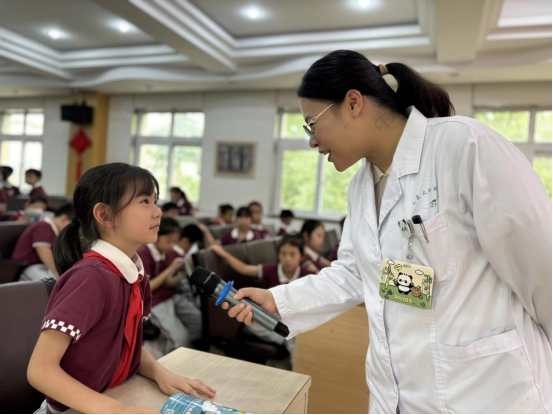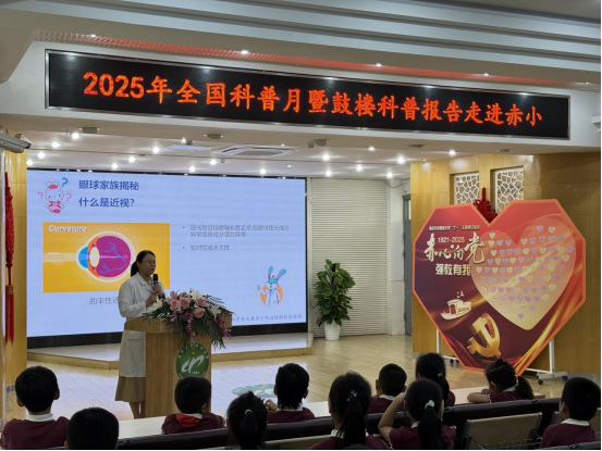本次活动由南京市眼视光学会、鼓楼区科学技术协会主办,南京医科大学眼科医院与赤壁路小学承办。活动特别邀请南京市近视防控科普宣讲团陈楠主任担任主讲,她用生动的图片、趣味的实验和通俗的语言,讲解近视发生的原因、日常用眼误区及预防要点,提醒同学们“户外活动每天两小时、读写姿势一尺一拳一寸、电子产品使用要有度”。学生们积极互动、踊跃回答,现场掌声不断。