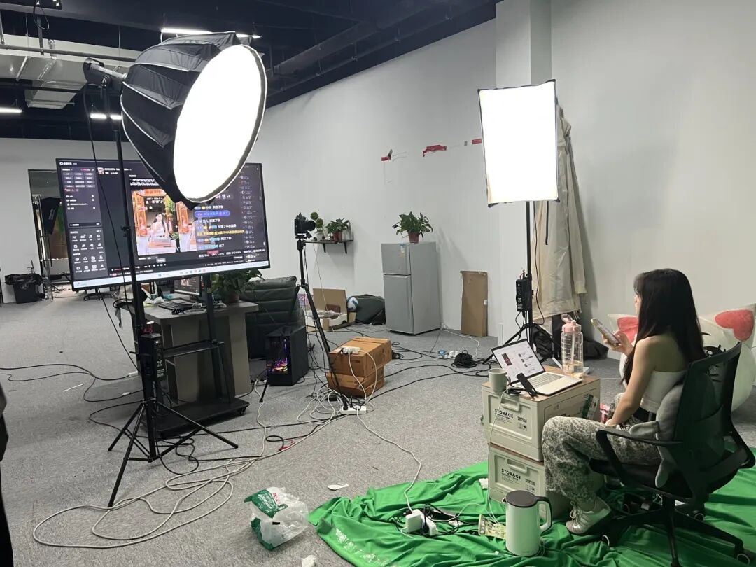 公司里,摄影补光灯前方,年轻的主播正在介绍牛肉自助餐的团券方法;摄影补光灯后方的小办公室里,年轻的技术人员则在电脑前忙着写大型直播复盘小结;摄影补光灯旁,地铺上摆着枕头和小毯子,这是主播们吃不消时睡觉的地方……