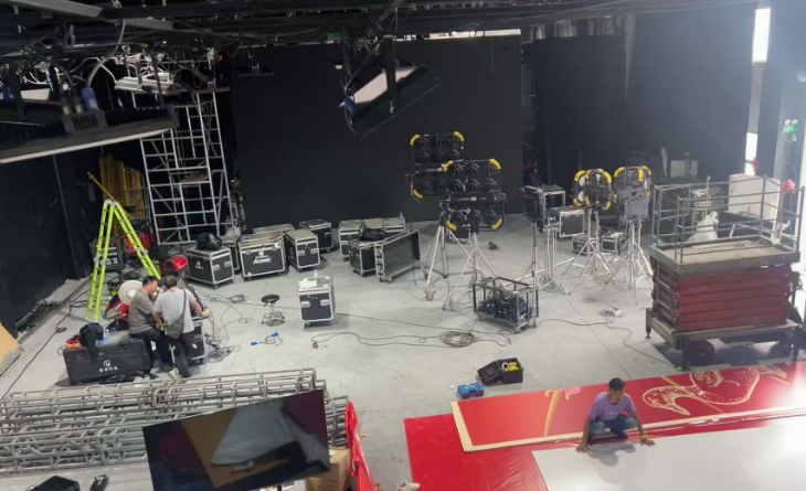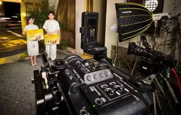 专业级摄影设备和灯光音响、喜庆的红色国风全景布景、4组主播严阵以待……9月28日,厂房影棚摇身一变成为一处大型国风演艺秀现场。