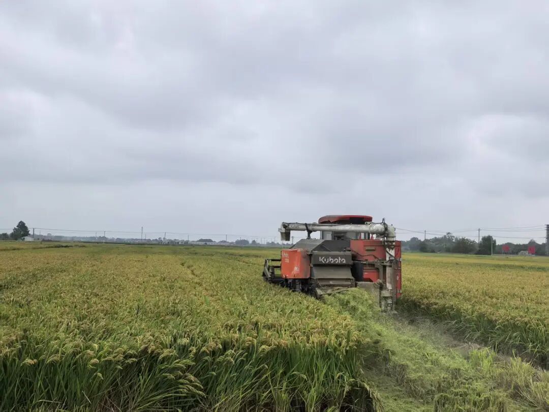 10月14日上午,高淳区陈福明谷物种植家庭农场一处稻田里,金灿灿的水稻如浪翻涌,两台联合收割机在田间灵活穿梭,不到10分钟,一亩多水稻便收割完毕,饱满的稻谷很快装满运输车,整个流程高效又顺畅。