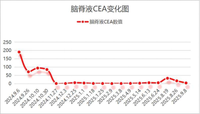 赵主任团队迅速制定方案:先通过Ommaya囊置入术建立脑脊液引流与给药通道,同步鞘内注射培美曲塞精准杀伤脑膜病灶,快速缓解神经症状;随后根据基因检测结果,序贯应用伏美替尼、依沃西双抗、埃万妥单抗等多代靶向药物。“每一次进展都不放弃,每一条通路都全力打通。”近1年来,团队像“拆弹专家”般动态调整治疗策略,如今于老爷子脑脊液肿瘤标志物CEA从最初的近200ng/mL降低至目前的个位数水平,生活已基本回归正常。