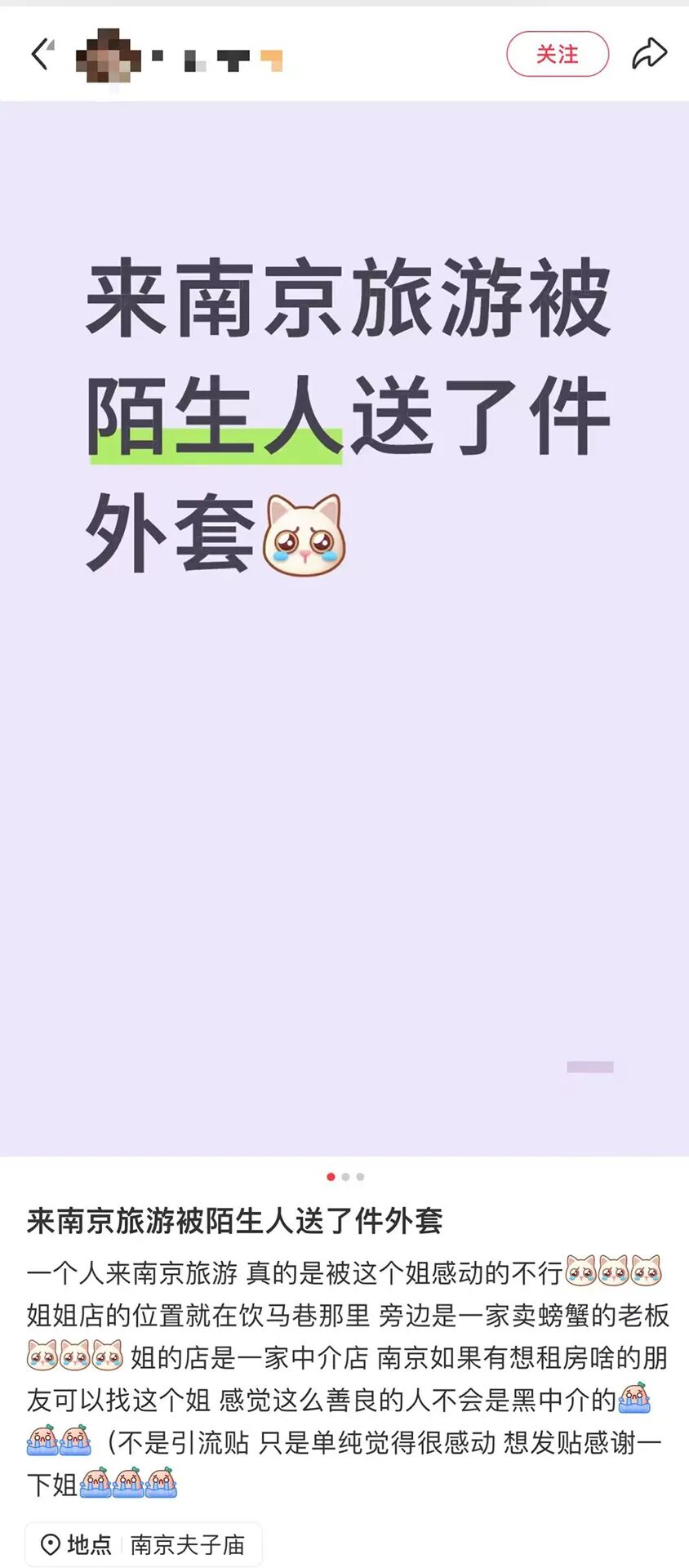 记者通过社交平台联系到发帖者——独自一人来南京旅游的24岁甘肃姑娘雒苑婷。她回忆,10月13日下午,她身着单薄的裙子在夫子庙附近游玩,突如其来的降温让她瑟瑟发抖,于是跟着导航想要找一家服装店购买外套,却在老城南饮马巷附近纵横交错的窄巷中迷了路。