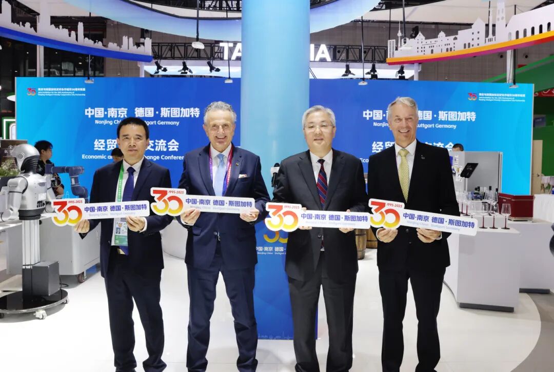 本届进博会国家馆首次设立中外友好城市展区,南京市与德国斯图加特市作为首对参展友城,共同呈现“南京与斯图加特友好合作城市30周年联展”。展览以“双城匠心·共赢未来”为主题,全方位展现两座城市在经贸、科技与文化交融中的合作成果,在会场内外产生了良好反响。5日下午,周红波与斯图加特市市长弗兰克·诺佩尔、斯图加特会展集团总裁普兰浩等出席开展欢迎仪式,参加南京—斯图加特经贸对接交流会。周红波与诺佩尔在致辞中回顾了两市结好三十年来交流交往历程,表示要深入落实两国元首重要共识,围绕智能汽车、精密机械、生物医药等重点领域,共建智能制造高地,提升双向投资水平,同时深化人文交流、织就民心相通纽带,共同开创合作共赢美好未来。