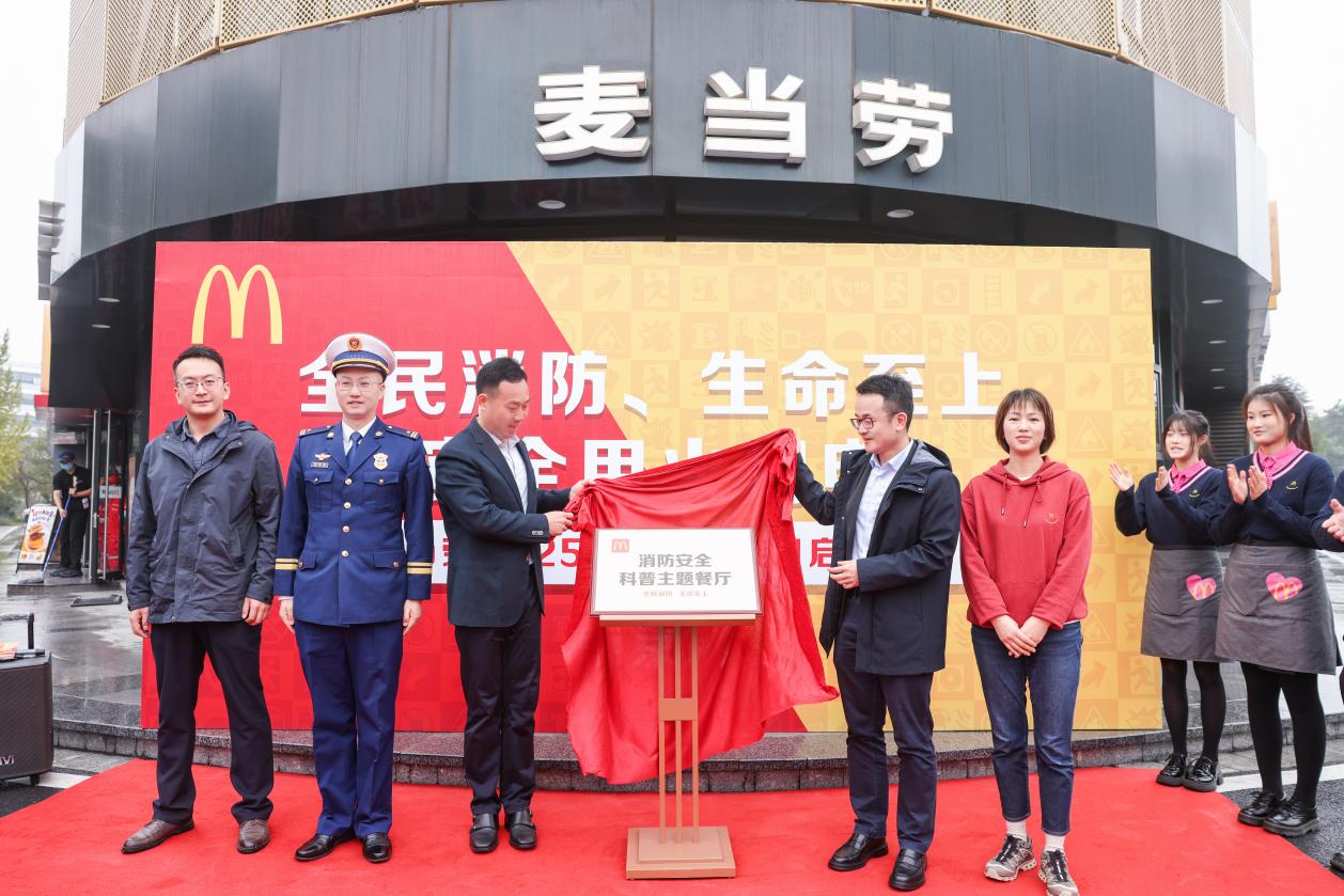活动现场,与会嘉宾为麦当劳徐庄路餐厅揭牌“消防安全科普主题餐厅”,该餐厅是南京首家消防主题餐厅。关注消防安全一直是麦当劳餐厅运营和企业社会责任的重要组成部分。江苏麦当劳始终扎根社区,将消防安全科普融入日常,做社区好邻居。麦当劳江苏市场总经理付振振表示:“目前江苏市场已有超过130家餐厅举办 ‘麦麦消防体验营’活动,近3000名顾客参与,获得了积极的社会反响。我们很高兴南京徐庄路餐厅成为今年的消防主题活动餐厅,希望通过生动有趣的形式,携手消费者,共同营造安心、安全的社区环境。”